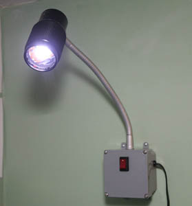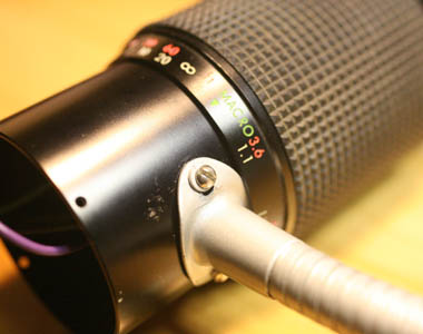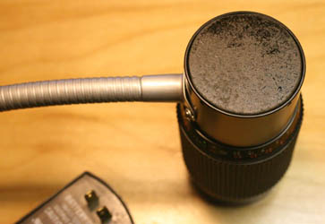 To mount the lamp I ripped apart an old gooseneck lamp I had collecting dust. One end of the gooseneck screwed directly into the lens' metal housing. This also acts to prevent the lens from "zooming" and advertently coming apart. The other end of the gooseneck is screwed into a standard plastic housing from the electrical department of my local Lowes. I wanted an industrial look to the lamp and this housing was just right. It was also just large enough to house the transformer. The transformer itself is an old wall-wart from some long-lost device. In use, it's output is an unregulated 5V DC. I don't like keeping things plugged in continuously so I wanted the power switch to be on the primary side of the transformer; hence the box. The power switch came from Radio Shack. All electrical connections are heat shrinked and taped.