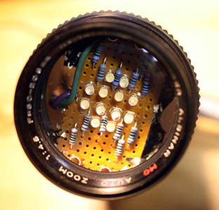 This particular Albinar 80-200mm zoom lens came apart easily, and when I was done playing with it, I had this idea of mounting some bright white LEDs inside the barrel of the lens and turning it into a funky lamp. The lamp would be a one-of-kind creation.