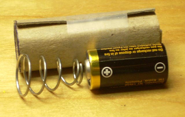 I made this contraption many years ago and have never had a problem using it. The spring was purchased at my local hardware store. It measures 3/4 inch in length (uncompressed), 1/2 inch diameter on the wide end, and 5/16 inch diameter on the narrow end. The cardboard tube is formed by rolling it around the PX28 battery to more than 5/8 inch diameter. The length of the tube is 1-3/4 inches long. The assembly is inserted as shown in the picture above - the negative end goes into the camera body, followed by the narrow end of the spring. There is minimal spring compression; just enough to hold things in place and make good electrical contact.
